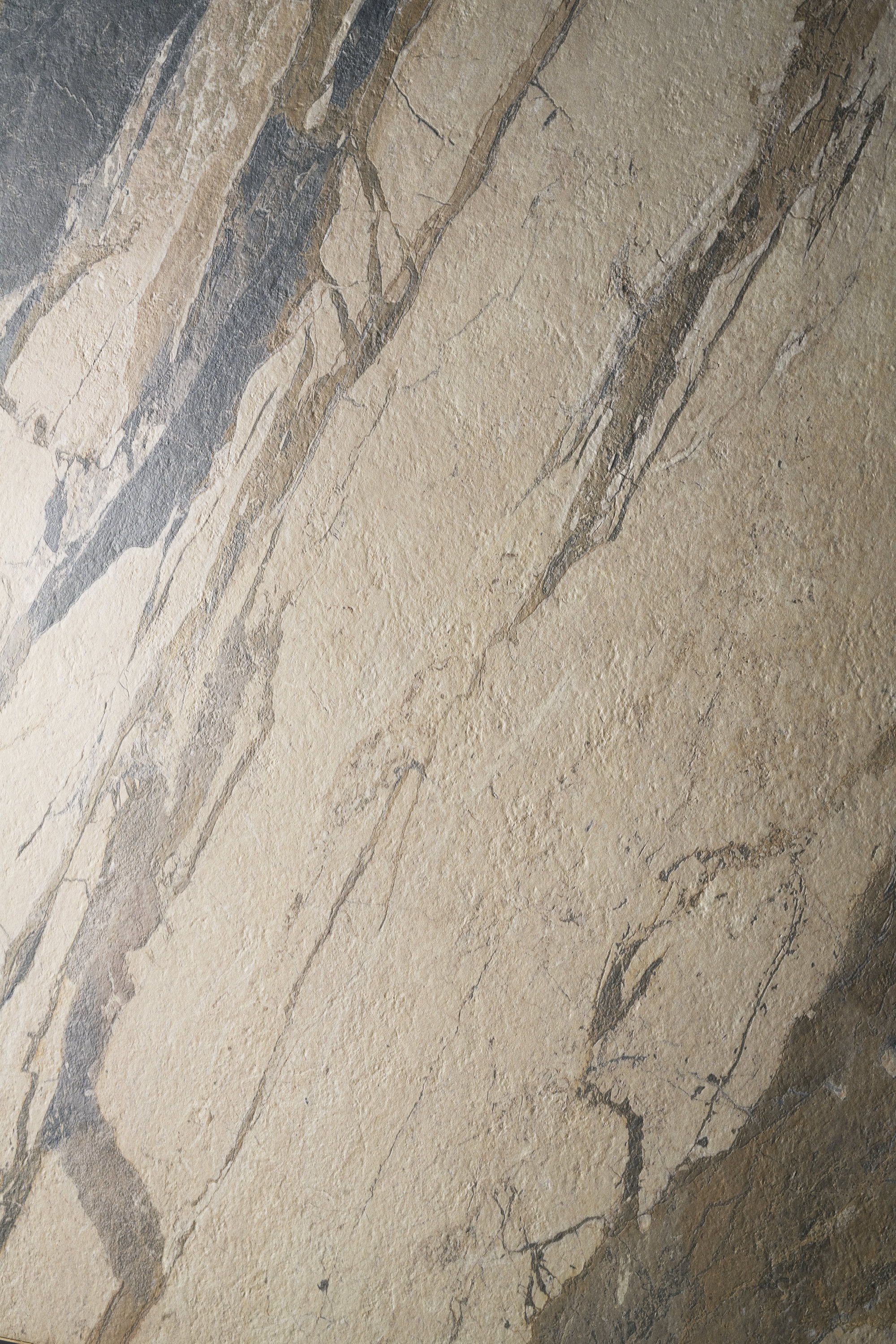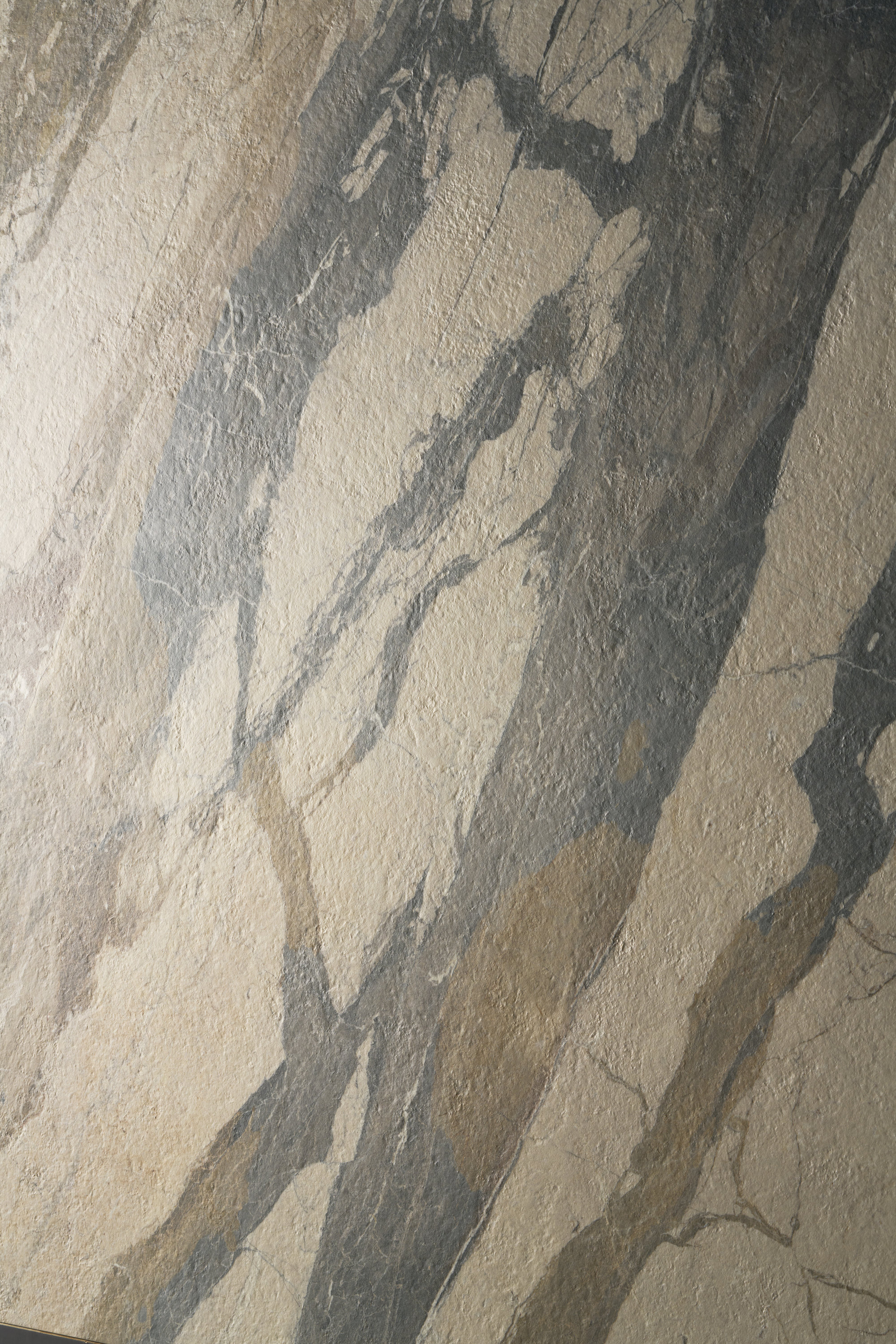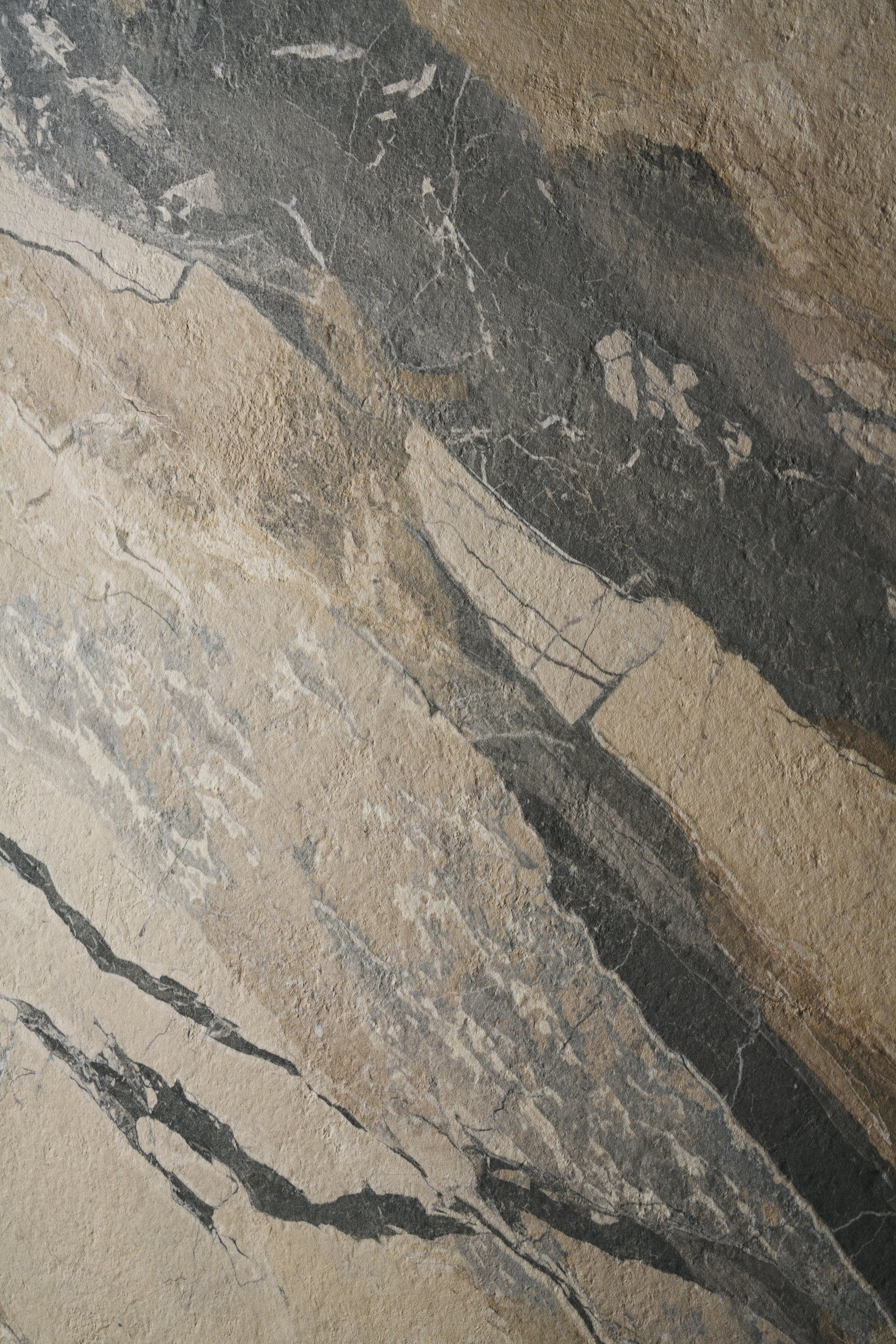 Ein Stein von großer visueller Energie, geprägt von einem Geflecht aus markanten Adern, die sich über einem hellen Hintergrund überlagern. Die Kontraste zwischen Grau, Weiß und dunkleren Tönen verleihen Tiefe und Bewegung, wie eine Oberfläche in ständiger Verwandlung. Breccia Phoenix ist für all jene gedacht, die Ausdruckskraft und Charakter suchen und die Oberfläche zum Protagonisten des Raums machen wollen. Erhältlich in den Ausführungen Natural und Natural Plus, in traditionellen Formaten und als Platte, bringt sie eine Sprache in die Räume, die zugleich kraftvoll und raffiniert ist. Die Großplatte Breccia Phoenix wird mit revolutionärer wasserbasierter Technologie hergestellt. Eine absolute Neuheit für die Branche, die ökologische Nachhaltigkeit mit höchster ästhetischer Qualität verbindet.