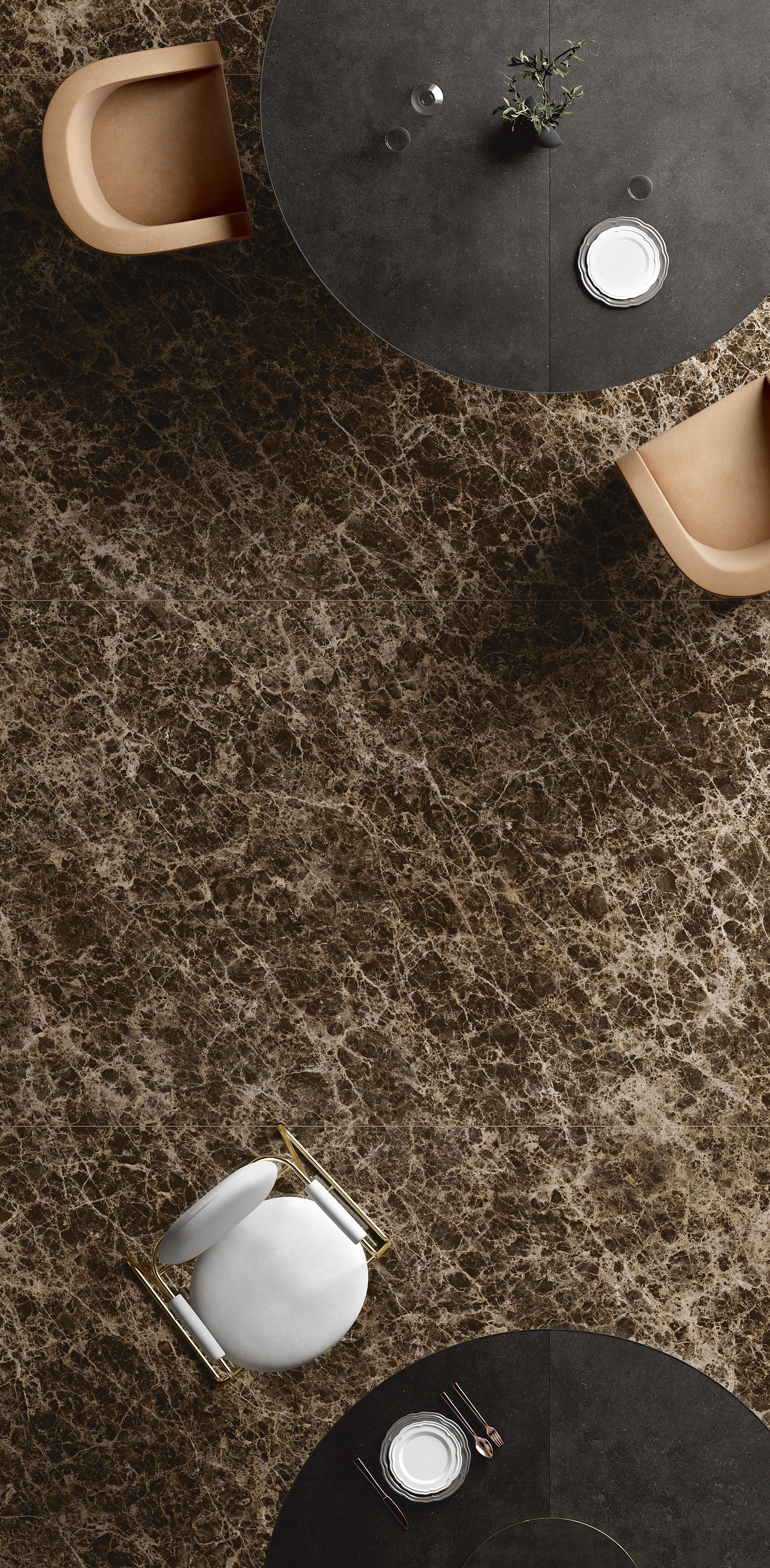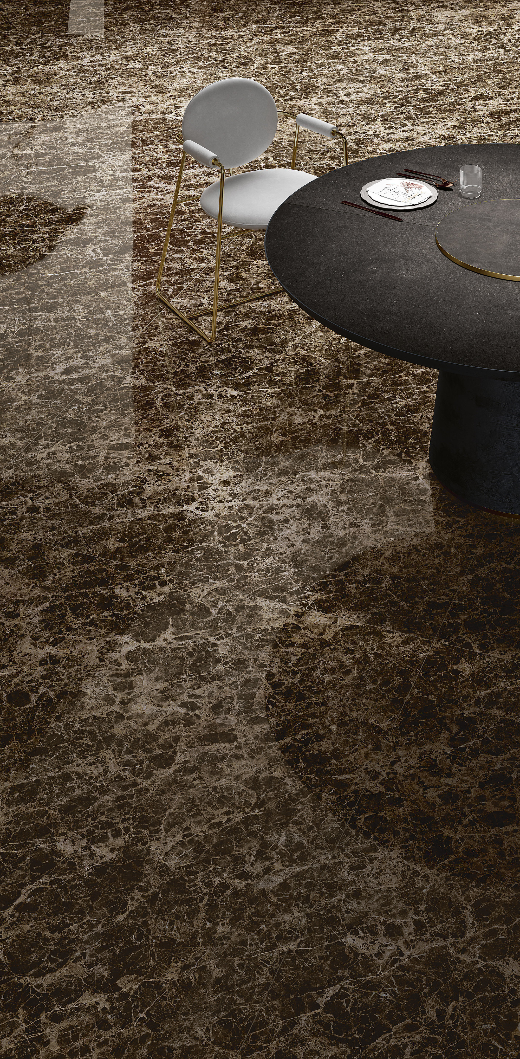 Deep Emperador zeichnet sich durch eine wunderschöne dunkelbraune, teilweise fast schwarze Farbe sowie warme Haselnuss-, Creme- und Karamelladern aus. Seine goldenen Nuancen und schillernden Reflexe machen Räume edel und exklusiv. Deep Emperador ist ideal für Innenböden und Wandverkleidungen, Außenfassaden sowie für feine, zeitgemäße dekorative Möbel.