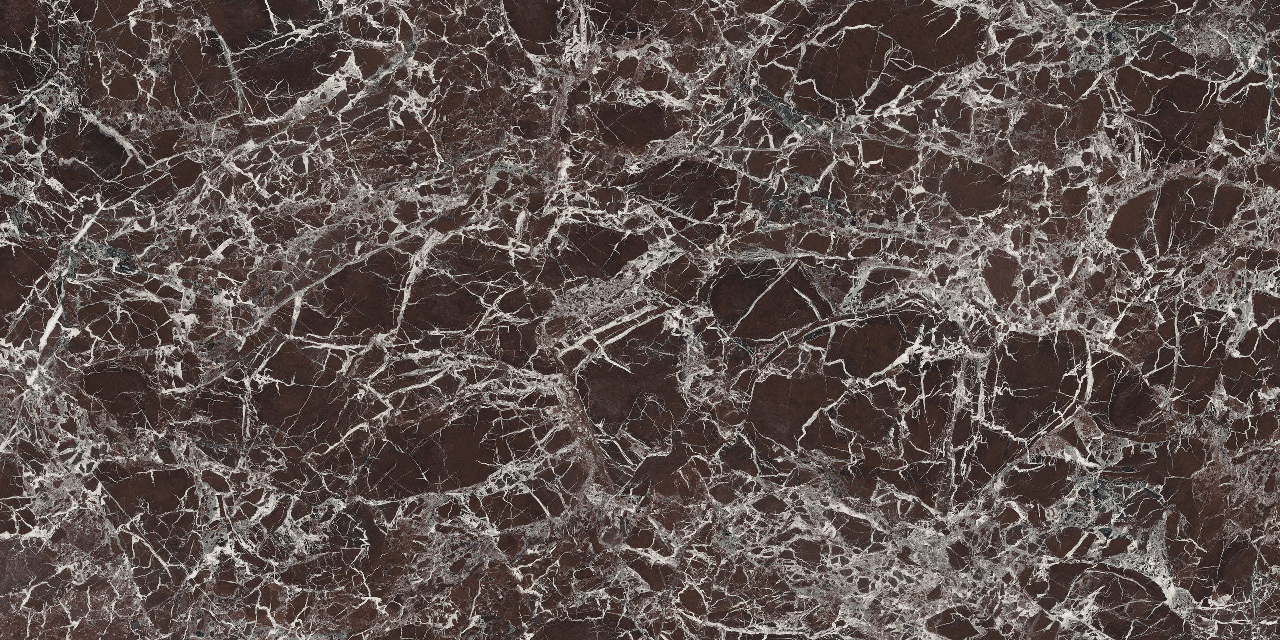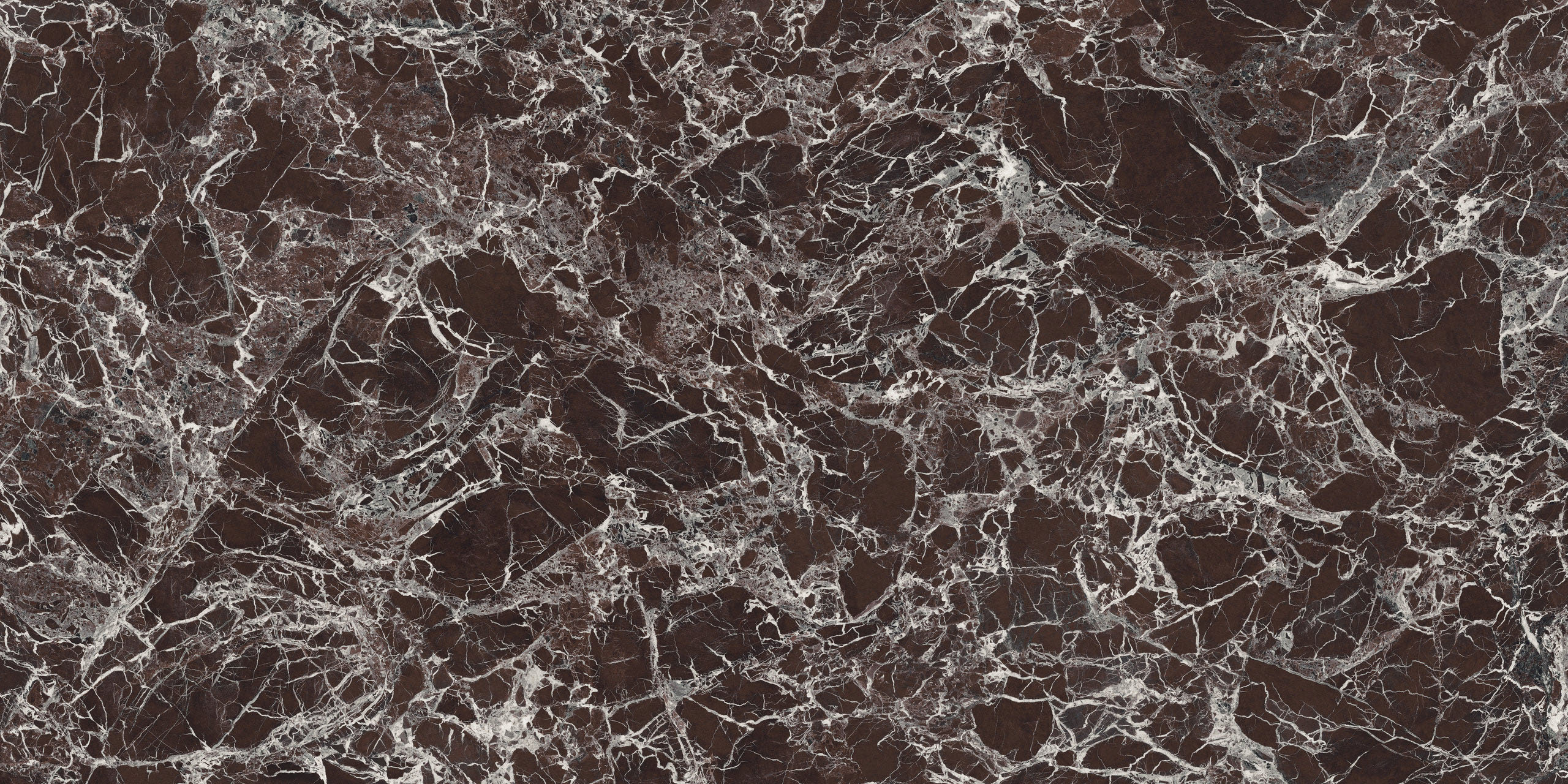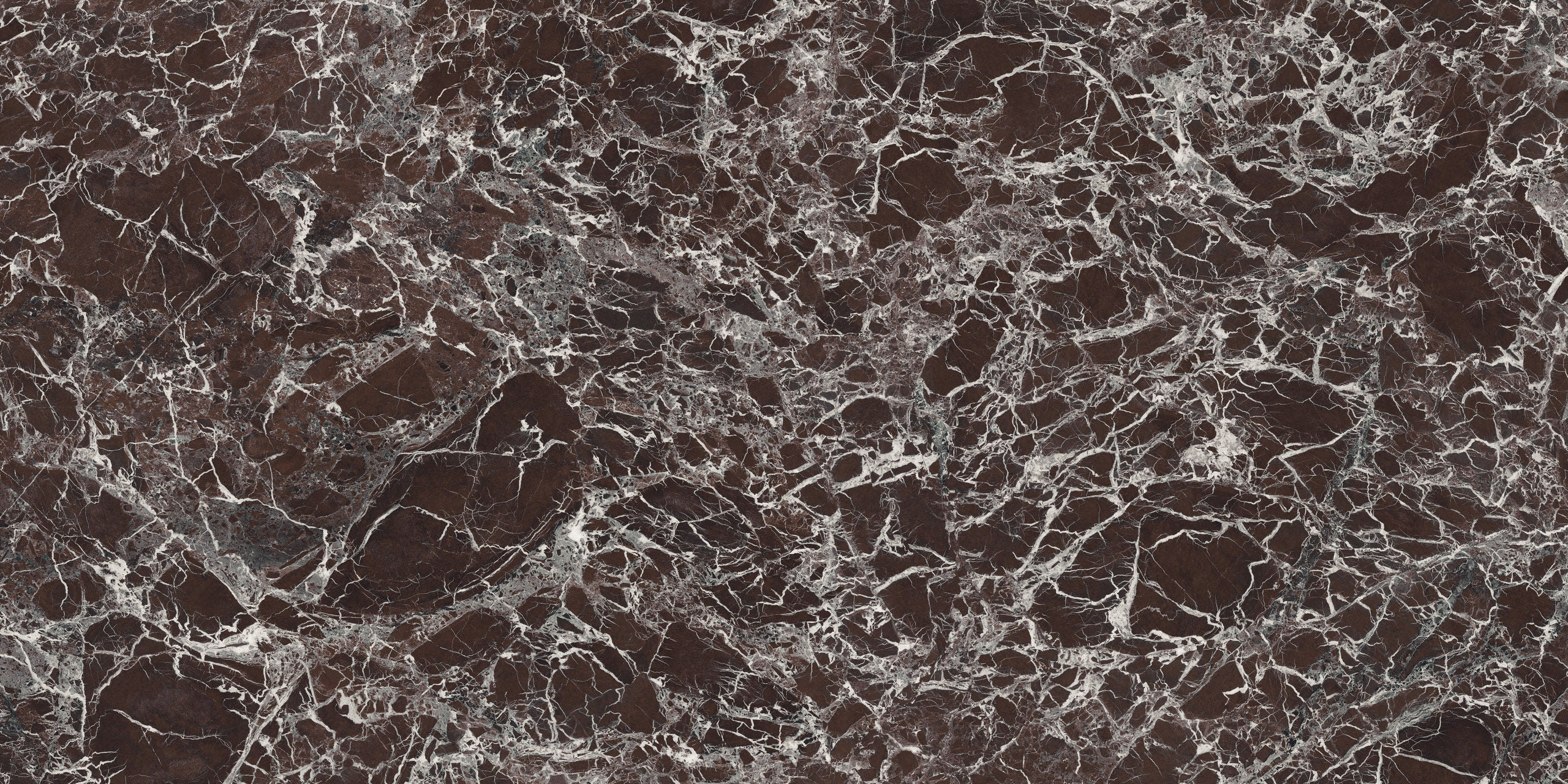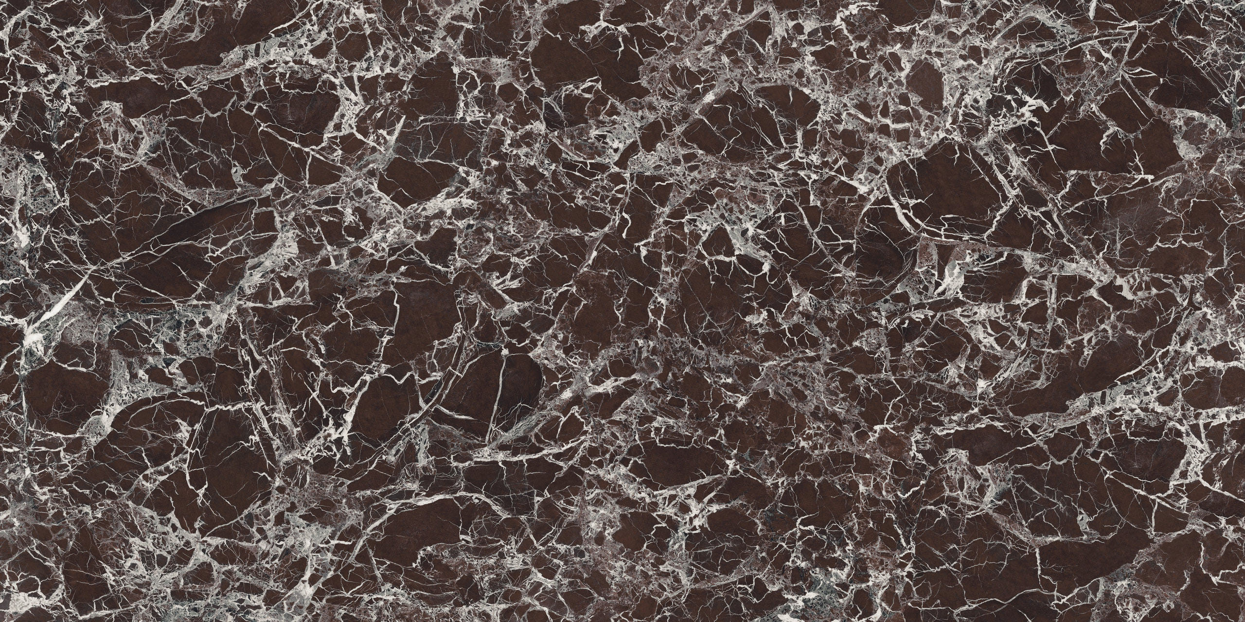 Das Brekzienmuster wird majestätisch, kaiserlich: ein dichtes Netz aus milchigen Äderungen auf einem purpur- und bordeauxfarbenen Mantel, das hier und da von dunklen, kühleren Intrusionen unterbrochen wird. Das minerale Gesamtwerk zeigt trotz seiner Strenge und Unberechenbarkeit eine gleichmäßige und gleichzeitig grenzenlos variable optische Identität.
