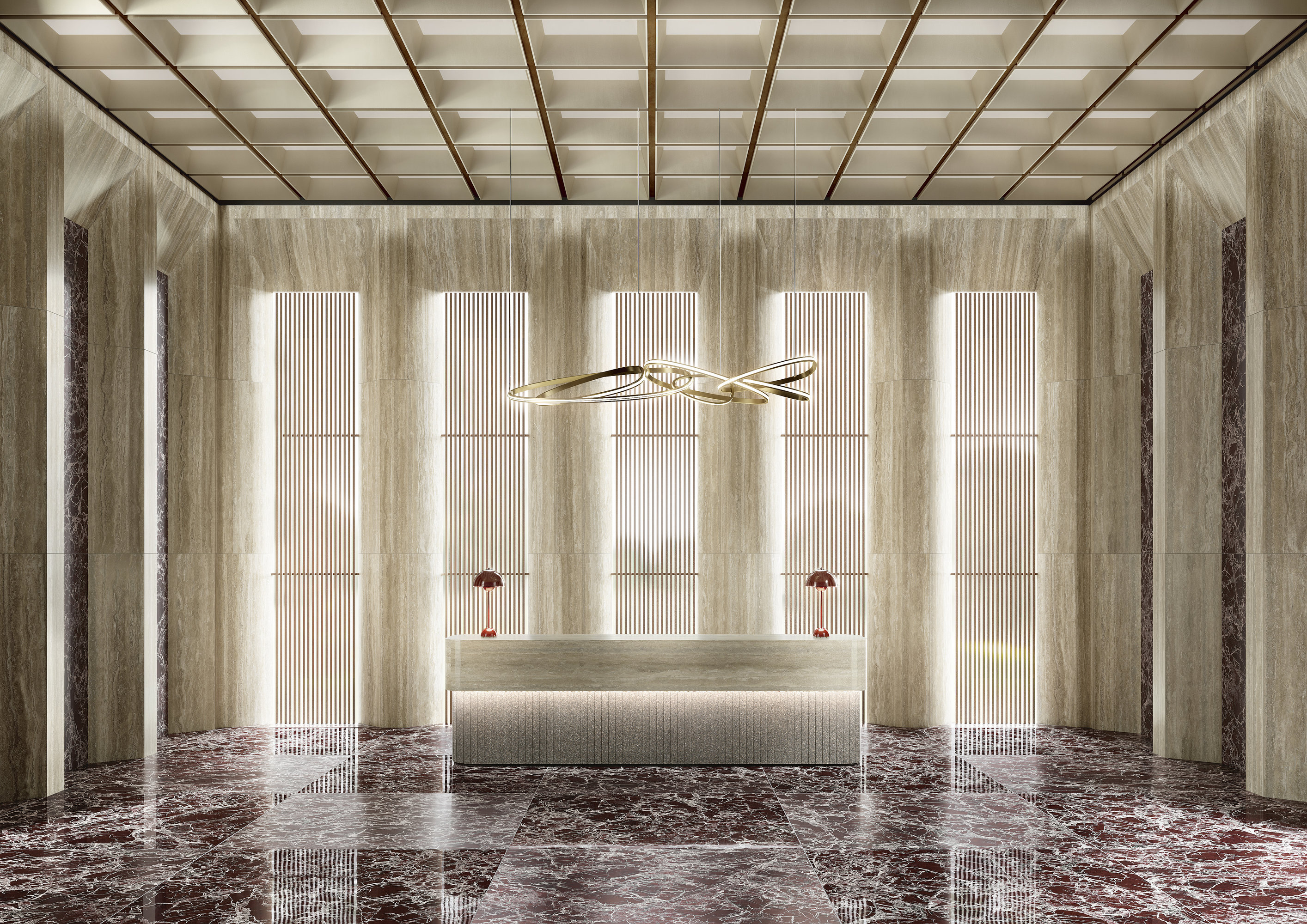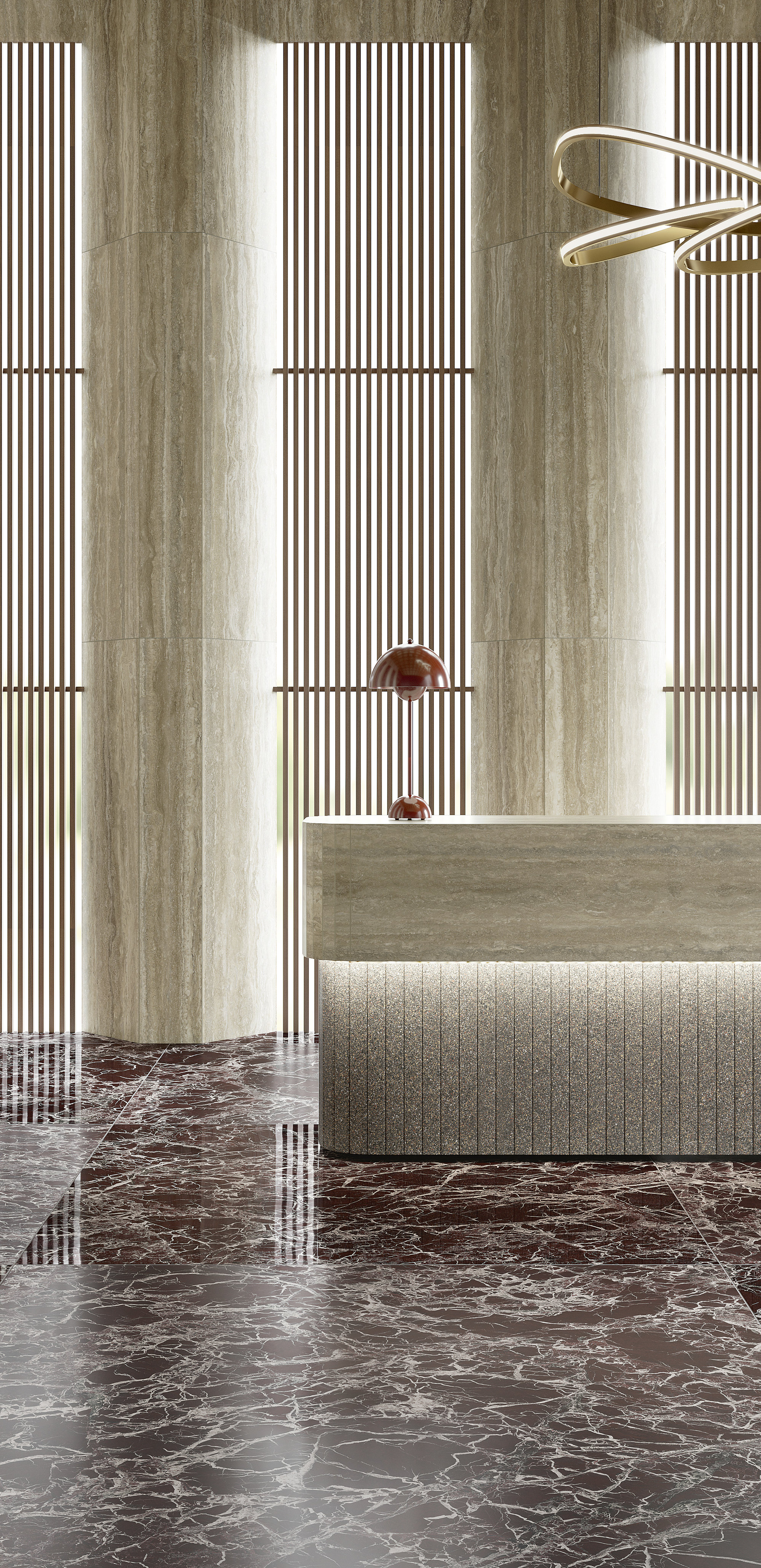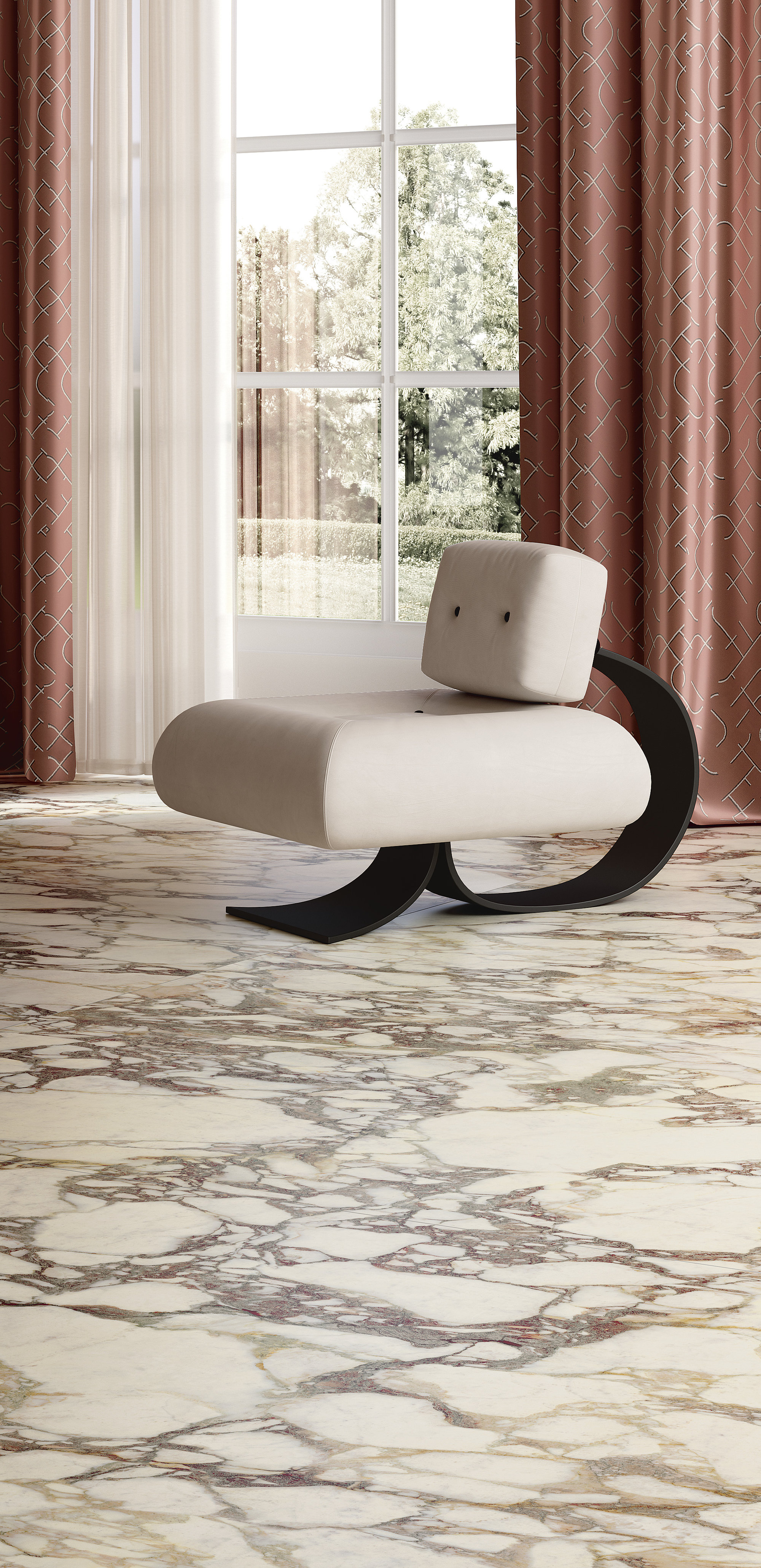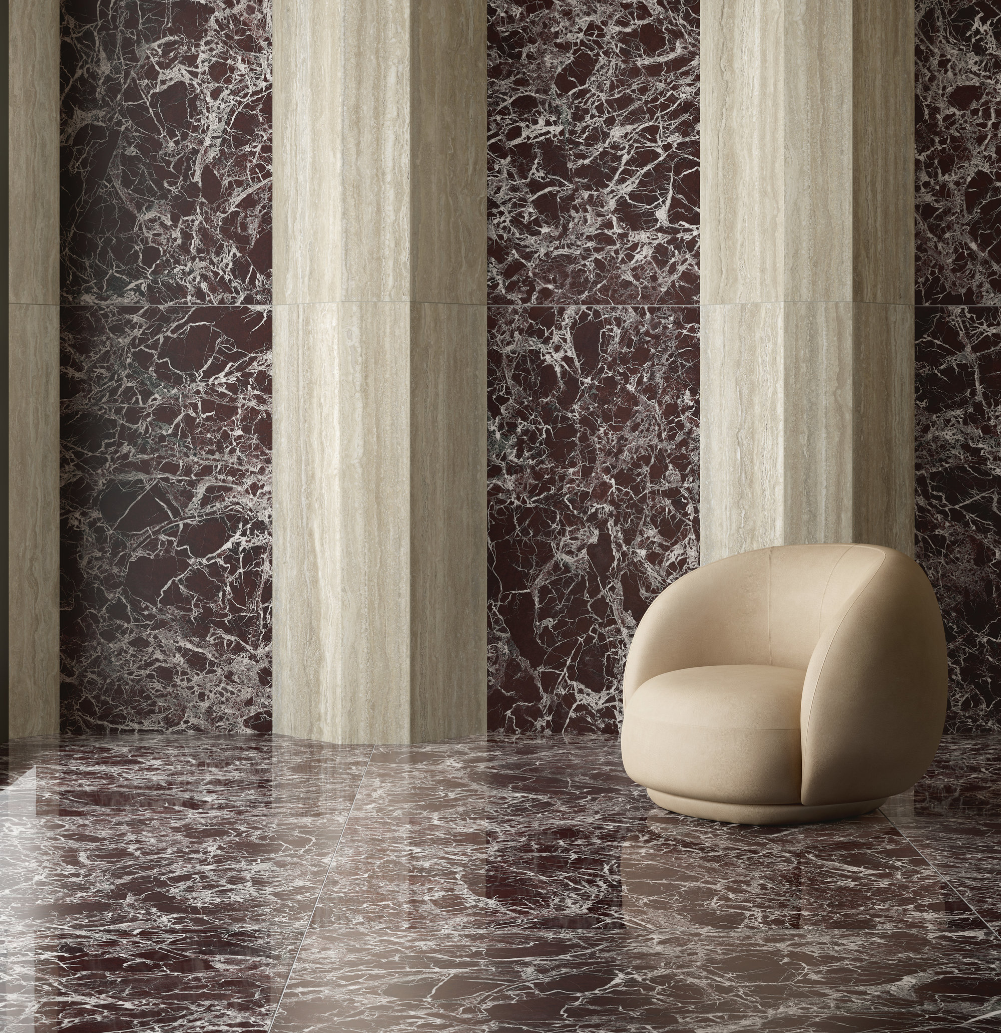 Das Brekzienmuster wird majestätisch, kaiserlich: ein dichtes Netz aus milchigen Äderungen auf einem purpur- und bordeauxfarbenen Mantel, das hier und da von dunklen, kühleren Intrusionen unterbrochen wird. Das minerale Gesamtwerk zeigt trotz seiner Strenge und Unberechenbarkeit eine gleichmäßige und gleichzeitig grenzenlos variable optische Identität.