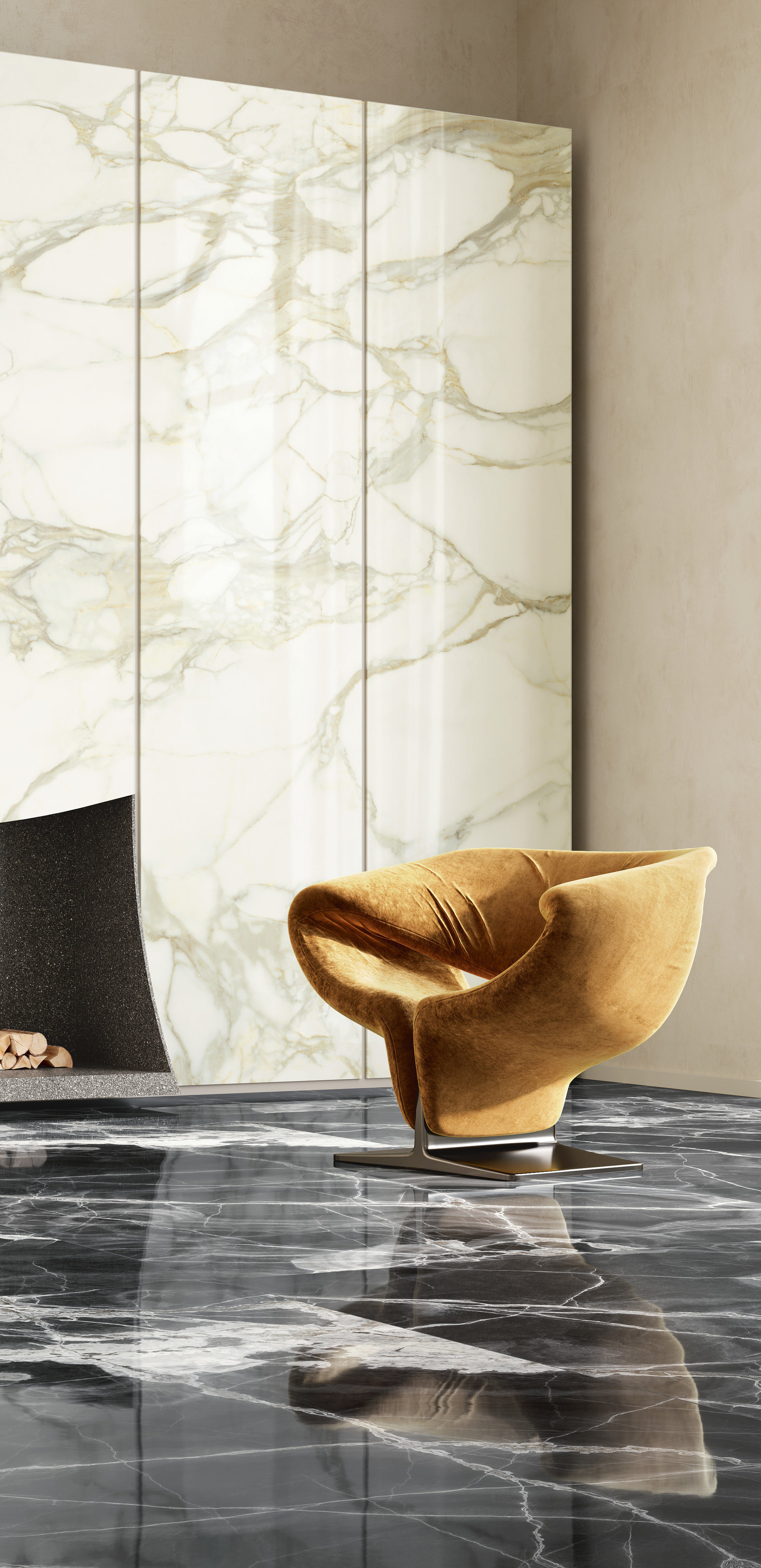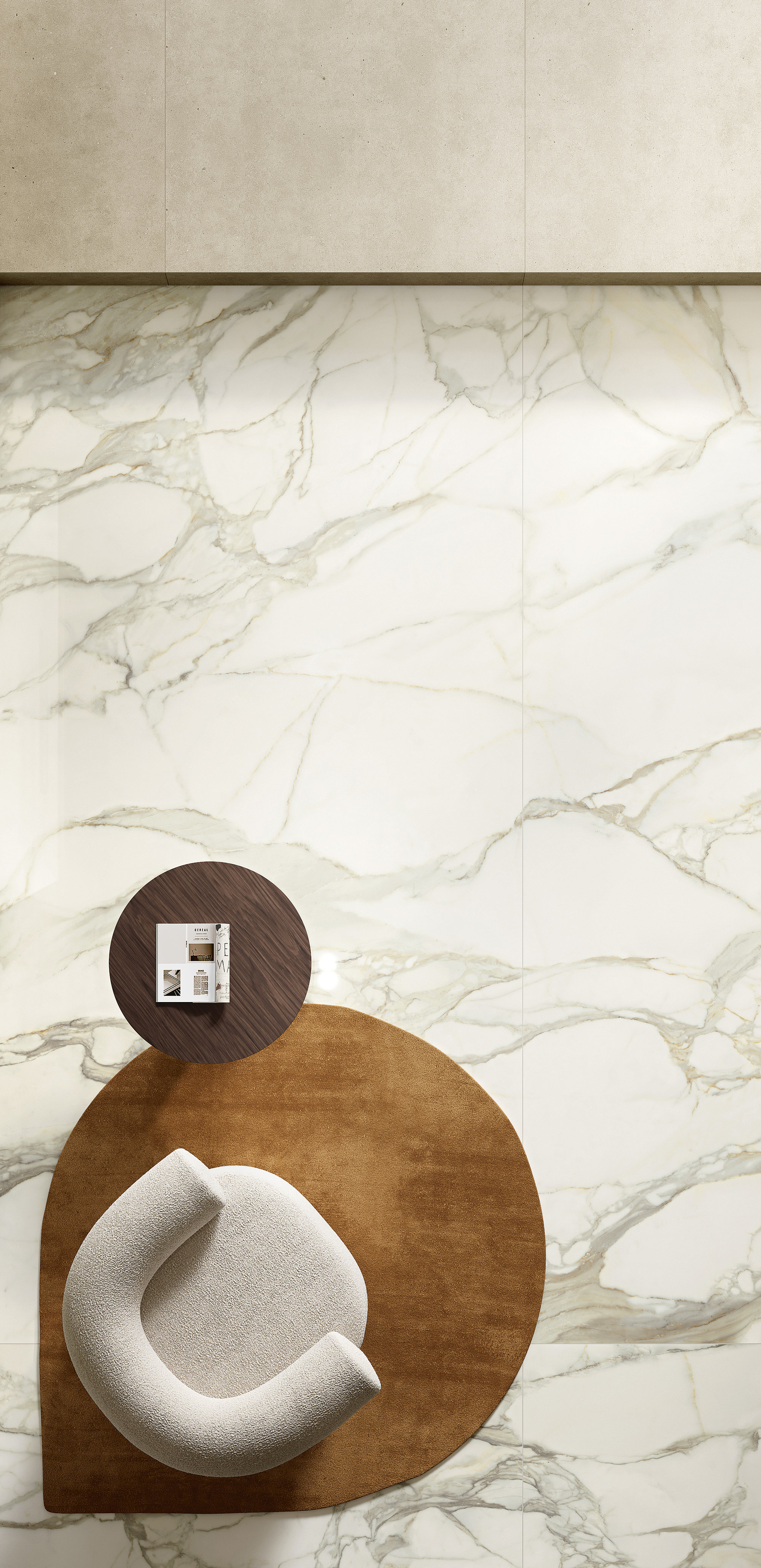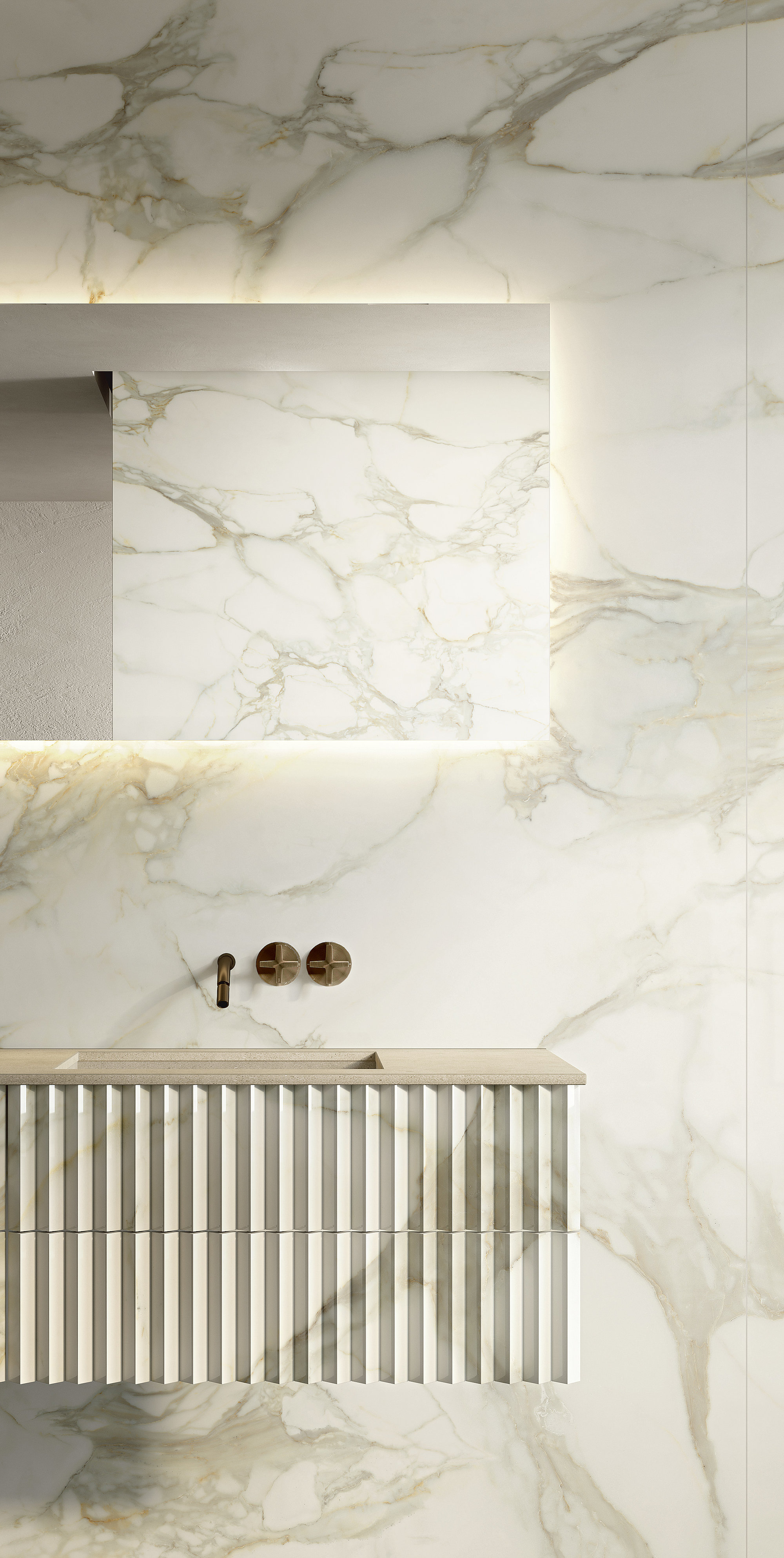 Calacatta Dorato zieht mit goldenen, tiefen und geschwungenen Adern die Aufmerksamkeit auf sich, die den Räumen Wärme, Bewegung und Raffinesse verleihen. Diese keramische Oberfläche eignet sich ideal zur Aufwertung von Privathäusern, gewerblichen Projekten und Hospitality-Objekten, bei denen hochwertiges Design nicht auf Kosten von Funktionalität, Widerstandsfähigkeit und einfacher Pflege gehen darf. Die Polished-Oberfläche verleiht der Textur Helligkeit und Glanz, während die Natural-Oberfläche ein mattes, moderneres Erscheinungsbild bietet. Erhältlich in klassischen und Maximum-Formaten.