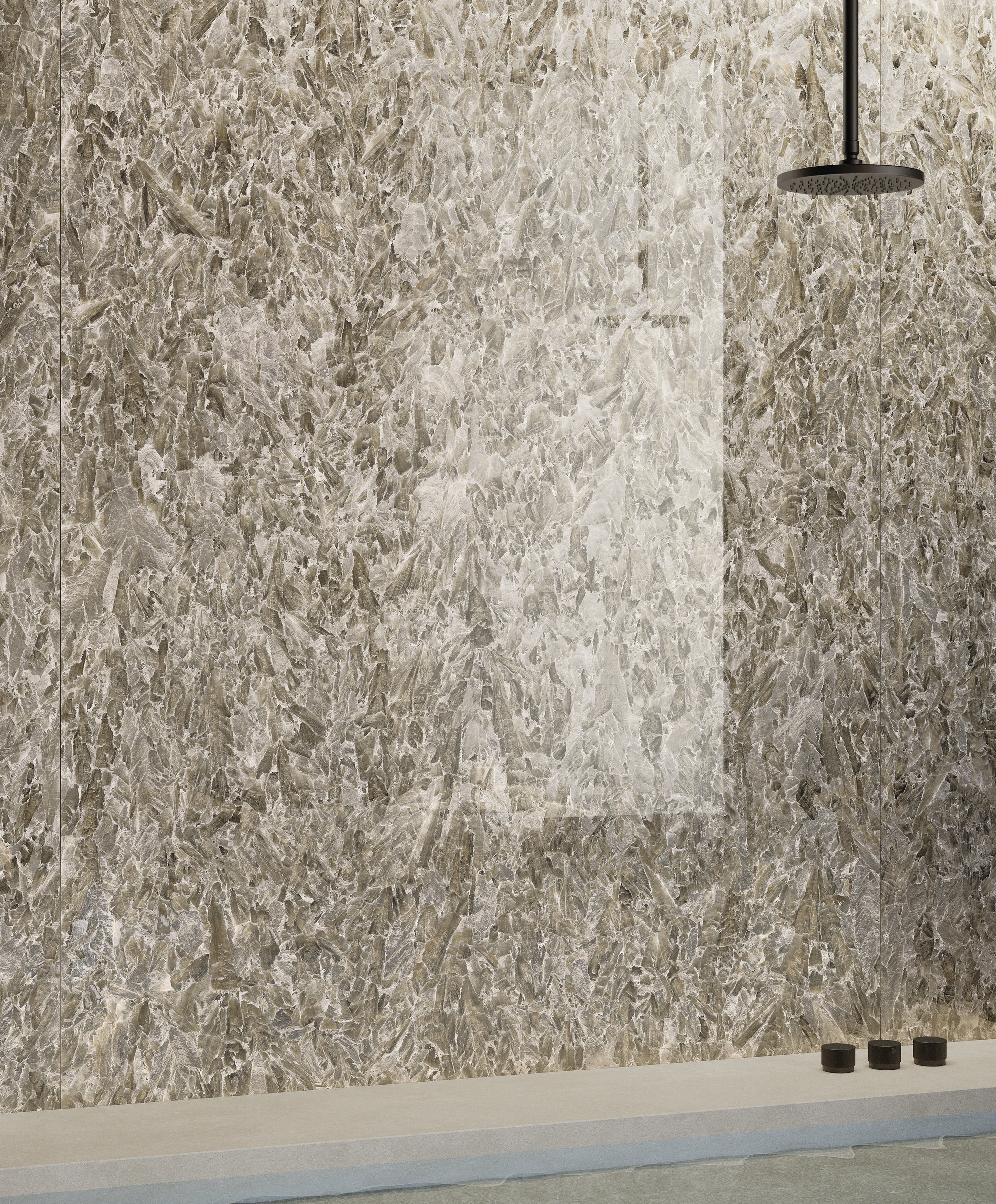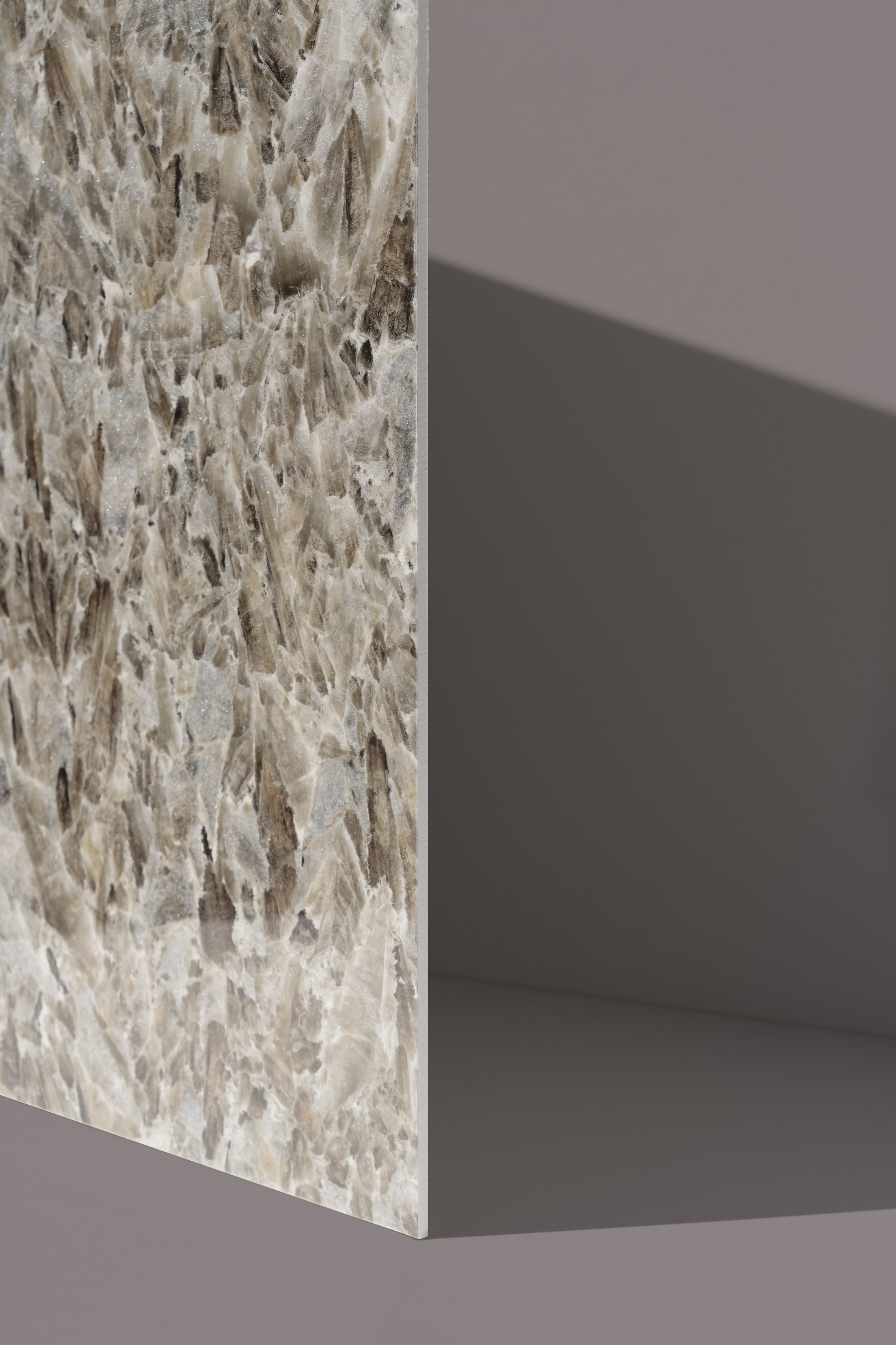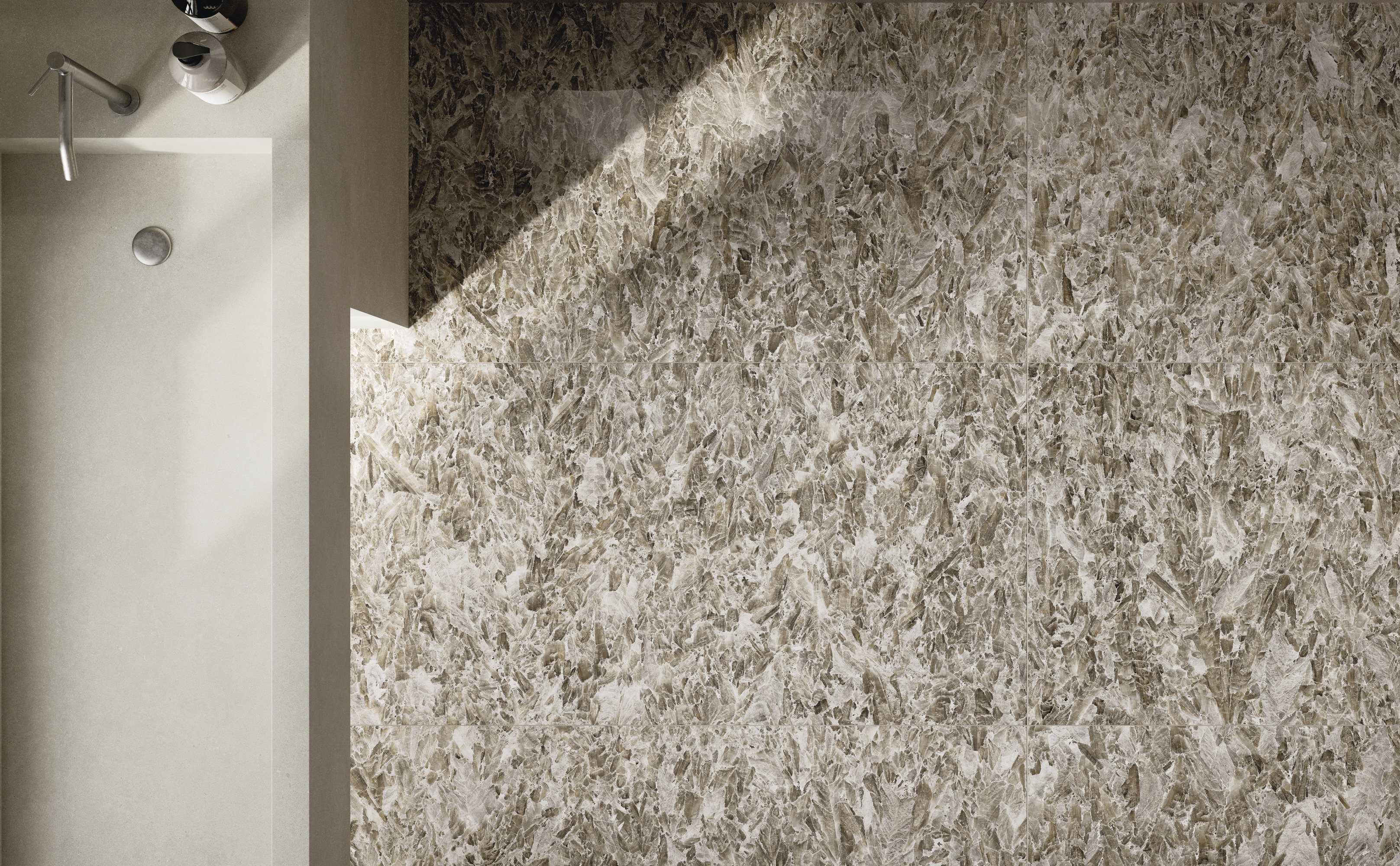 Die glänzenden Eigenschaften des keramischen Materials werden durch Hell-Dunkel-Schattierungen und Nuancen in Grautönen hervorgehoben und vermitteln ein angenehmes Gefühl der Behaglichkeit. Das exklusive Jewel-Finish verleiht der Oberfläche üppige silbrige Reflexe; dank einer alchemistischen Verbindung zwischen einem schillernden Mineral und einem glasartigen Material verschmilzt das Licht kristallinen Effekt, der sich in den „Lücken“ der Textur ausbreitet.