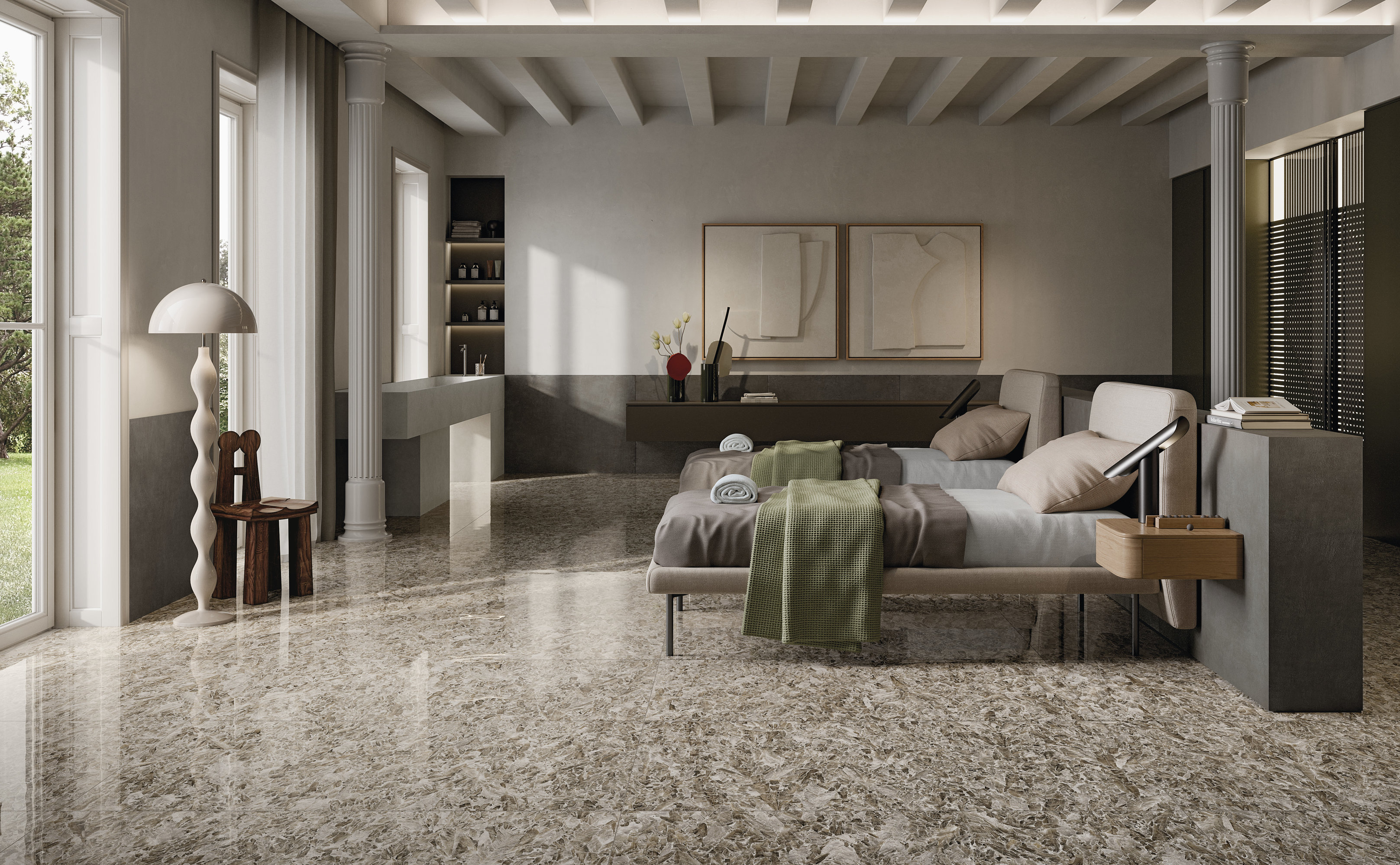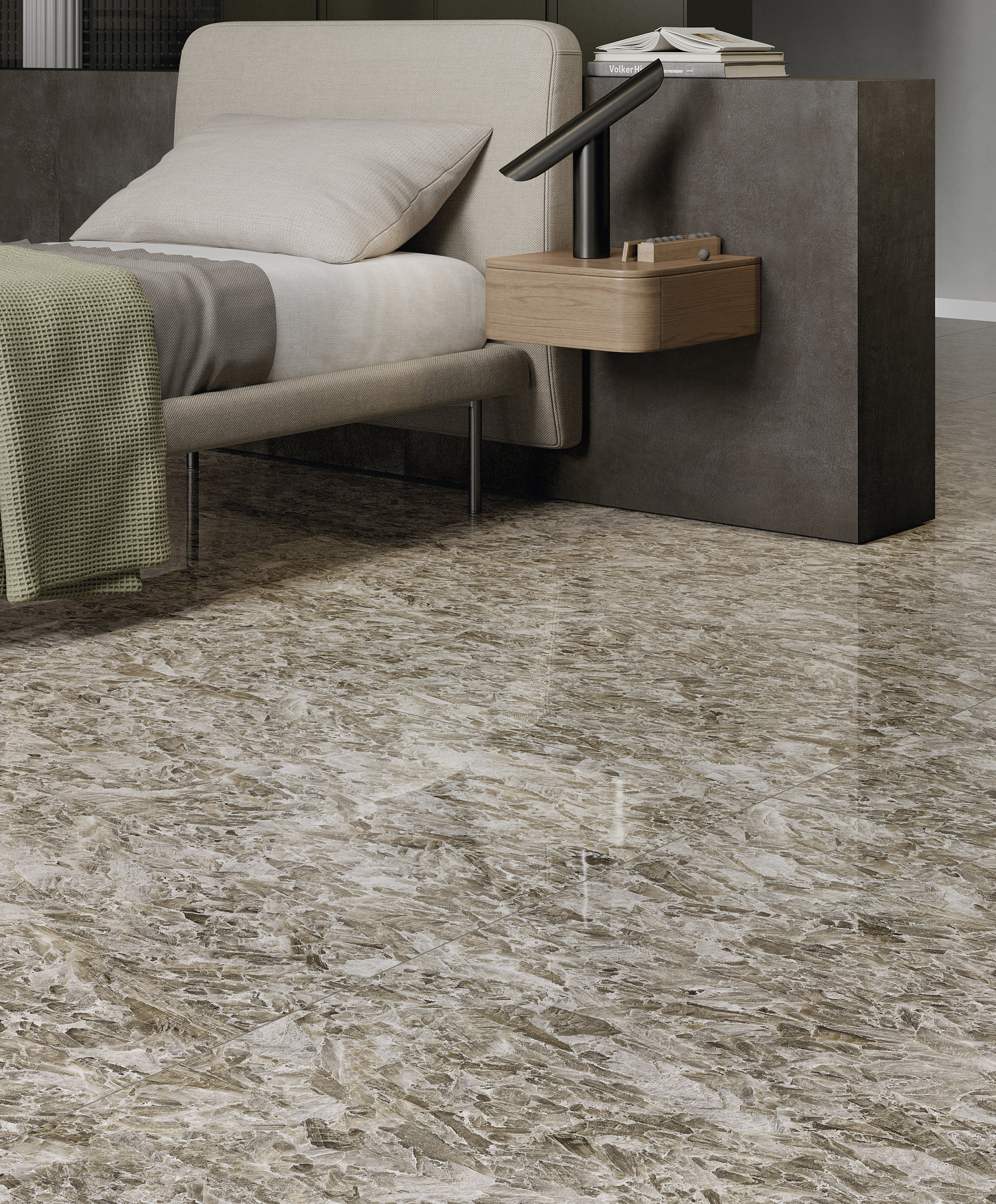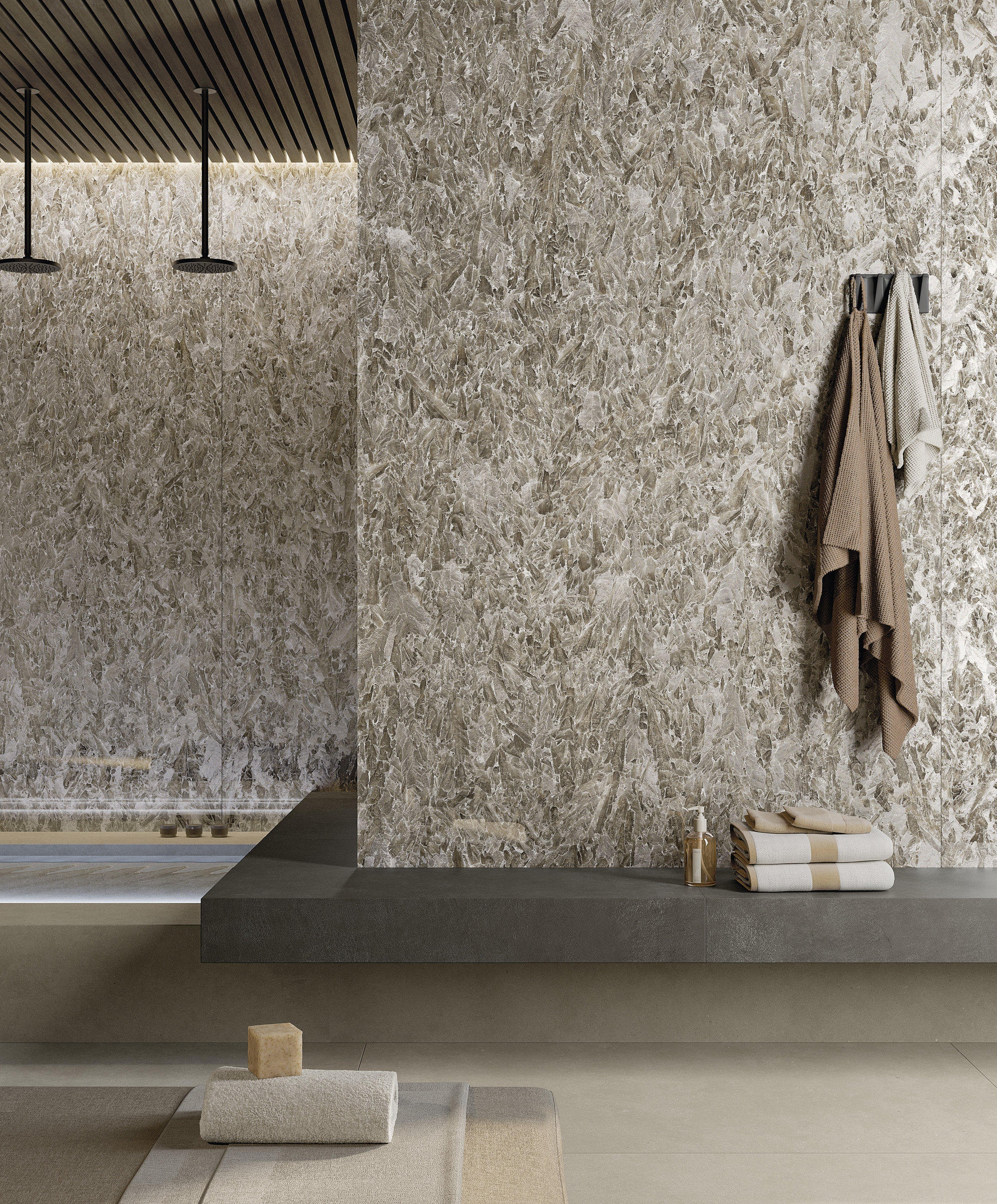 Die glänzenden Eigenschaften des keramischen Materials werden durch Hell-Dunkel-Schattierungen und Nuancen in Grautönen hervorgehoben und vermitteln ein angenehmes Gefühl der Behaglichkeit. Das exklusive Jewel-Finish verleiht der Oberfläche üppige silbrige Reflexe; dank einer alchemistischen Verbindung zwischen einem schillernden Mineral und einem glasartigen Material verschmilzt das Licht kristallinen Effekt, der sich in den „Lücken“ der Textur ausbreitet.